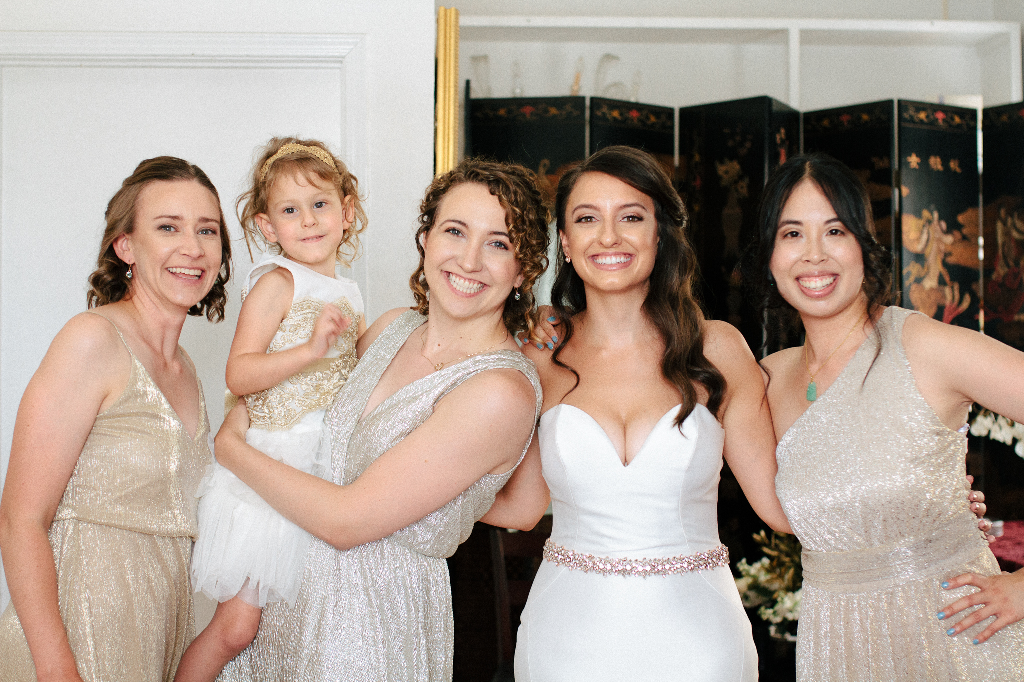 bridesmaids pose with the flower girl-1
