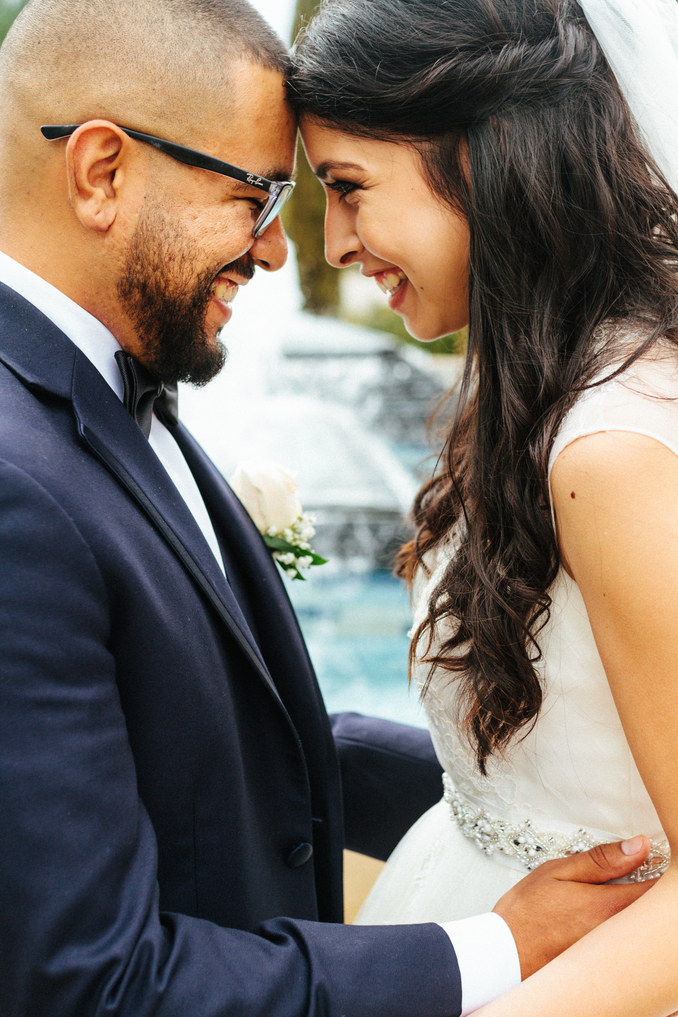 bride and grooms place foreheads together and smile