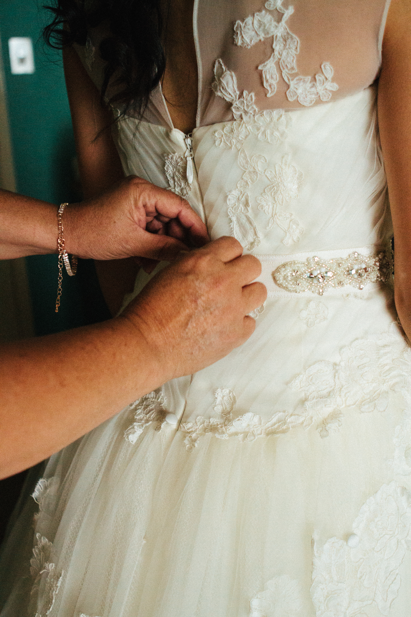 brides mother fastens dress