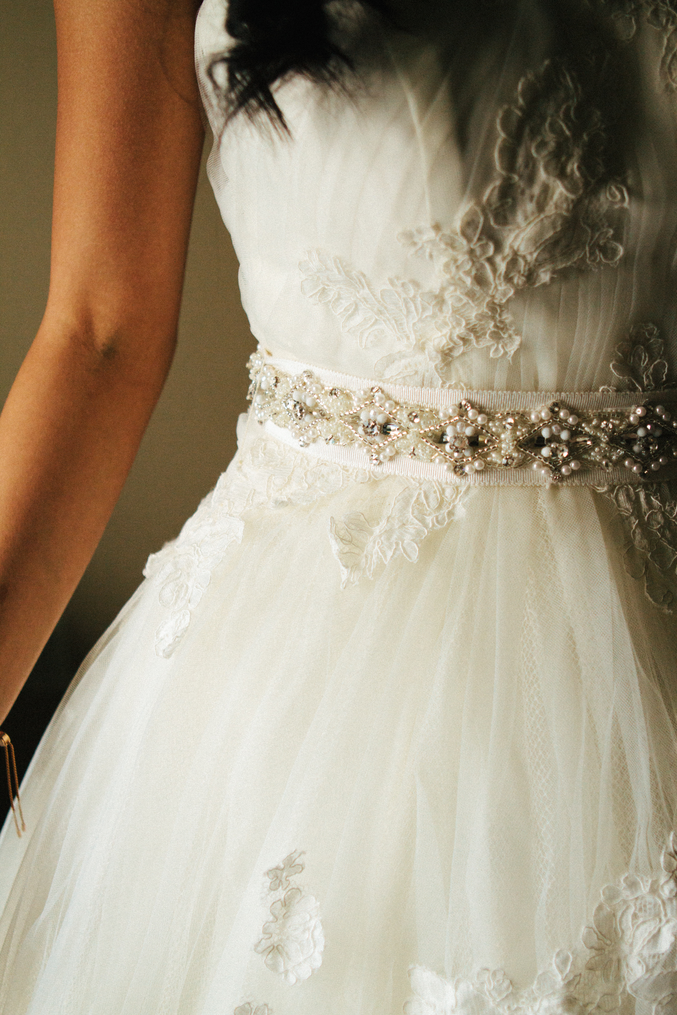 detail shot of brides belt on dress