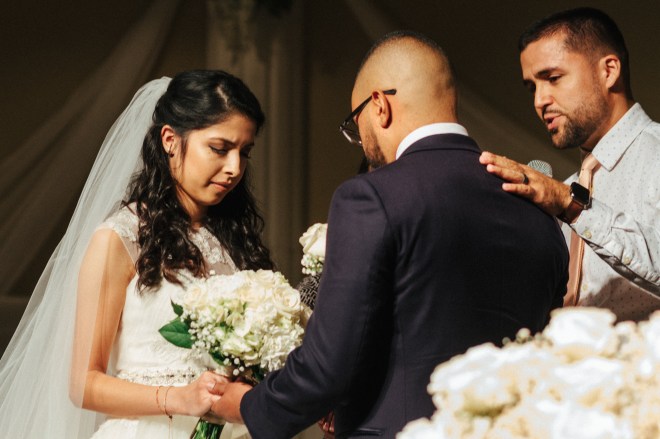 friend prays over the bride and groom_