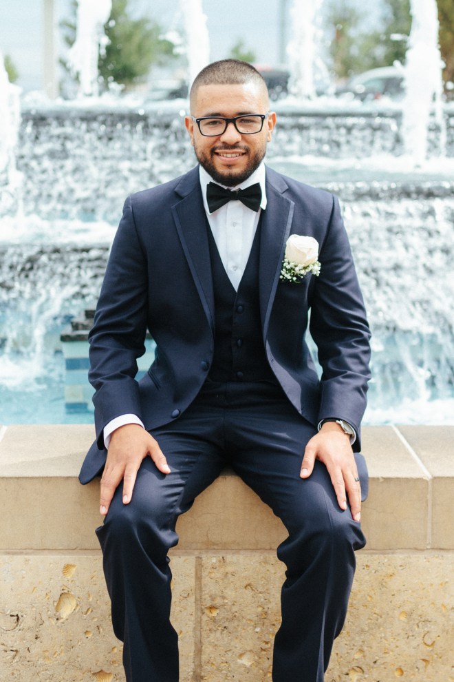 groom sits in front of fountain